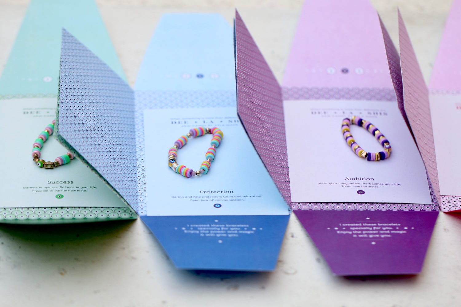 Hi. I'm Ayla. I'm 8 and I created this company because I think its fun to make bracelets but also because each colored eye on my bracelets protects a special power and it spreads positivity. Every person needs to know they are special, and they should protect their specialness with a Dee *LA *Shis bracelet.