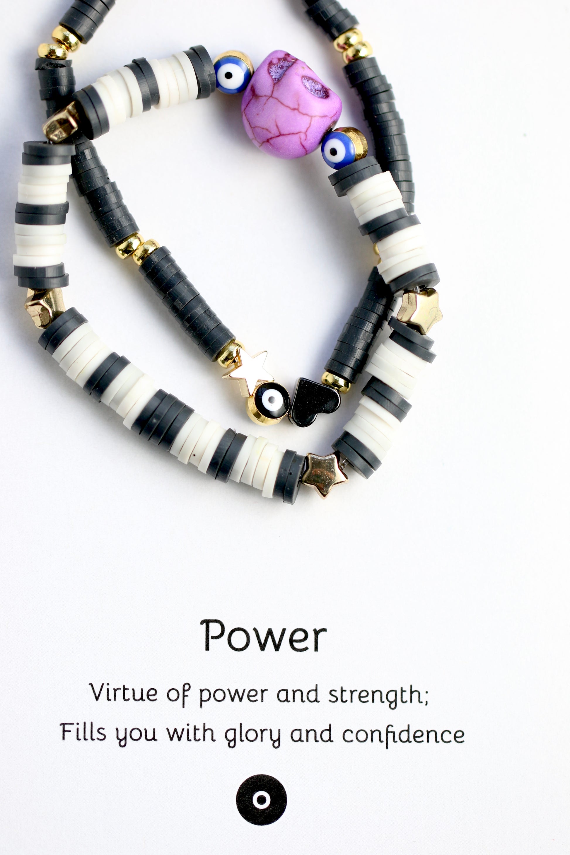 Smile & Sun Noir is a slimmer bracelet with 14 kt star and beads and a black heart that screams im powerful. The black evil eye protects power and strength.